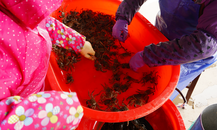 由于今年天气寒冷,扣蟹没有进入提前放置好的地笼中,需将扣蟹专用养殖蟹塘里的水抽干后,蟹农踩着齐膝深的淤泥,火眼金睛地将调皮的蟹宝宝从水草里挑拣出来,集中装入笼网内。